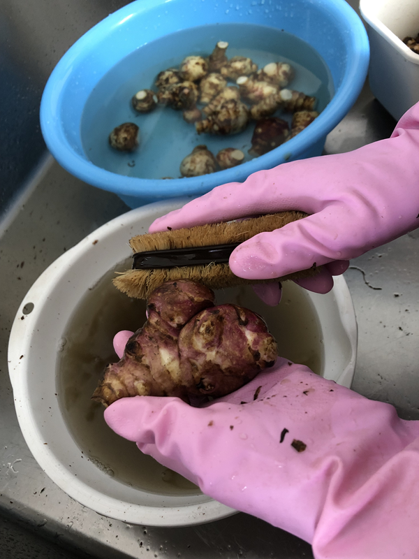 今年の菊いもは猛暑のせいか収穫は残念ながら例年の半分ほど。11月の雨風吹く中、みんなでがんばって収穫しました。